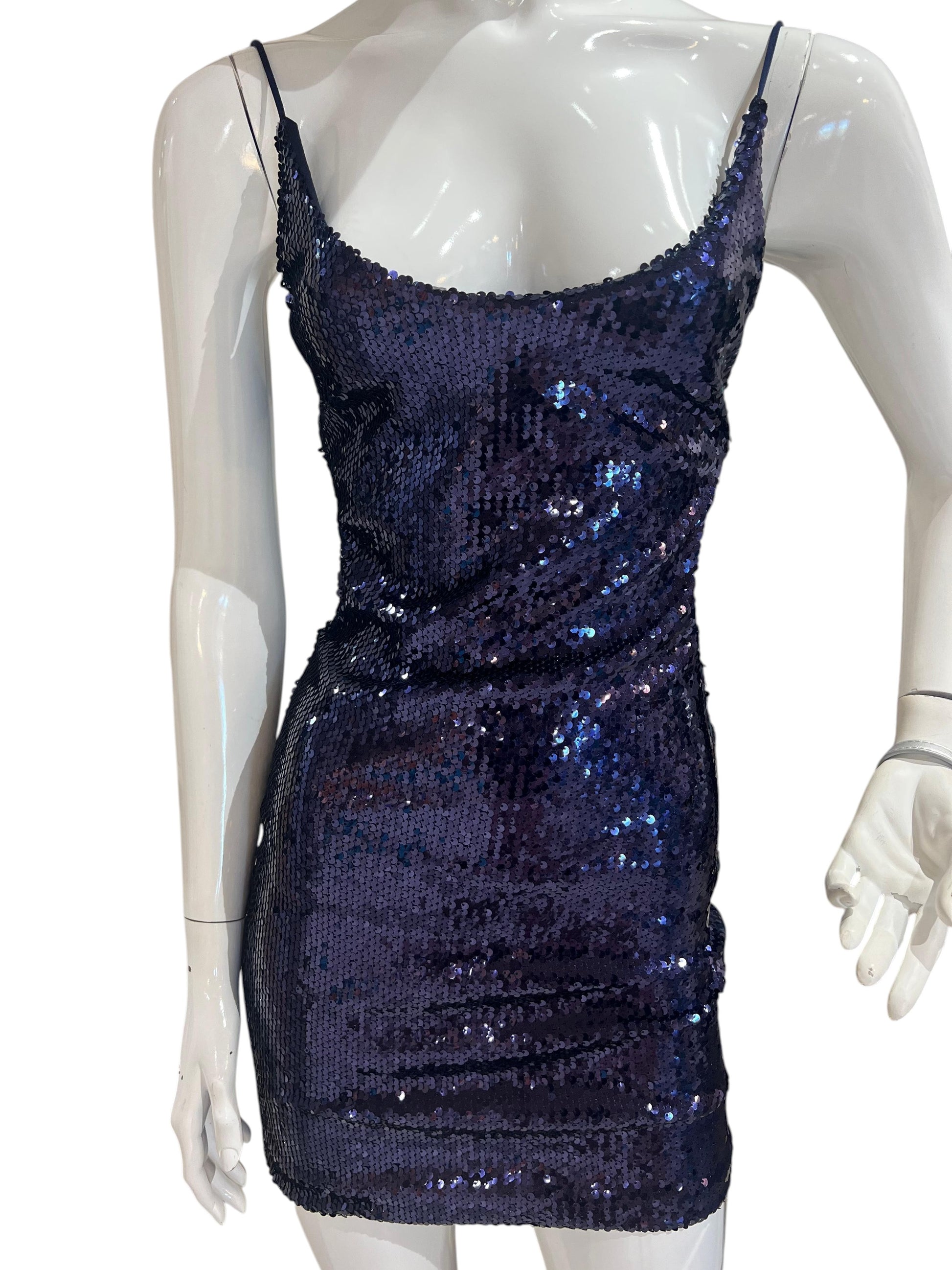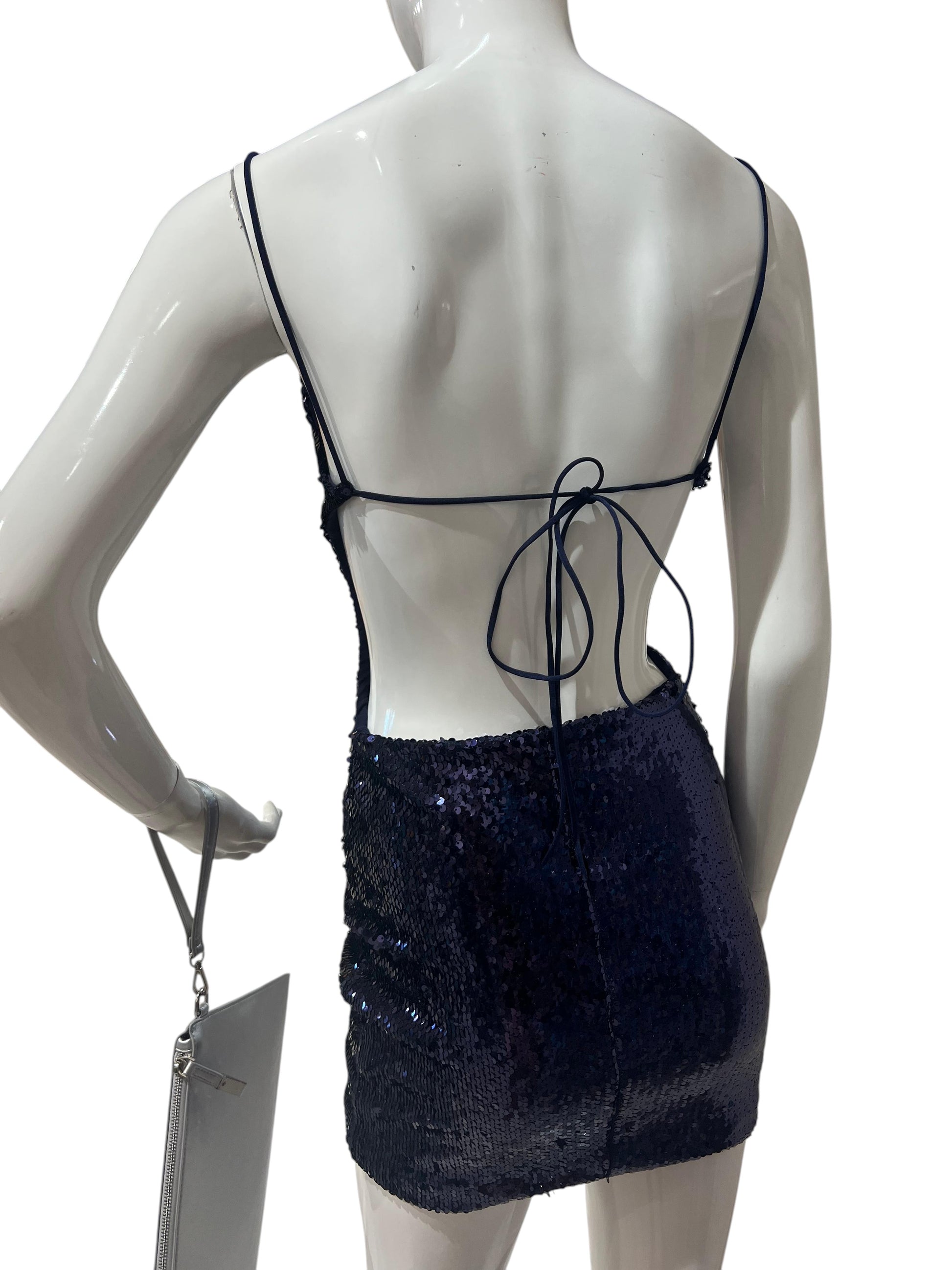 Questo abito corto in paiettes blu scuro, con schiena scoperta e taglia unica, unisce eleganza e comfort grazie alla fodera interna che garantisce una vestibilità piacevole. Perfetto per occasioni speciali, valorizza la silhouette con un tocco di brillantezza sofisticata.