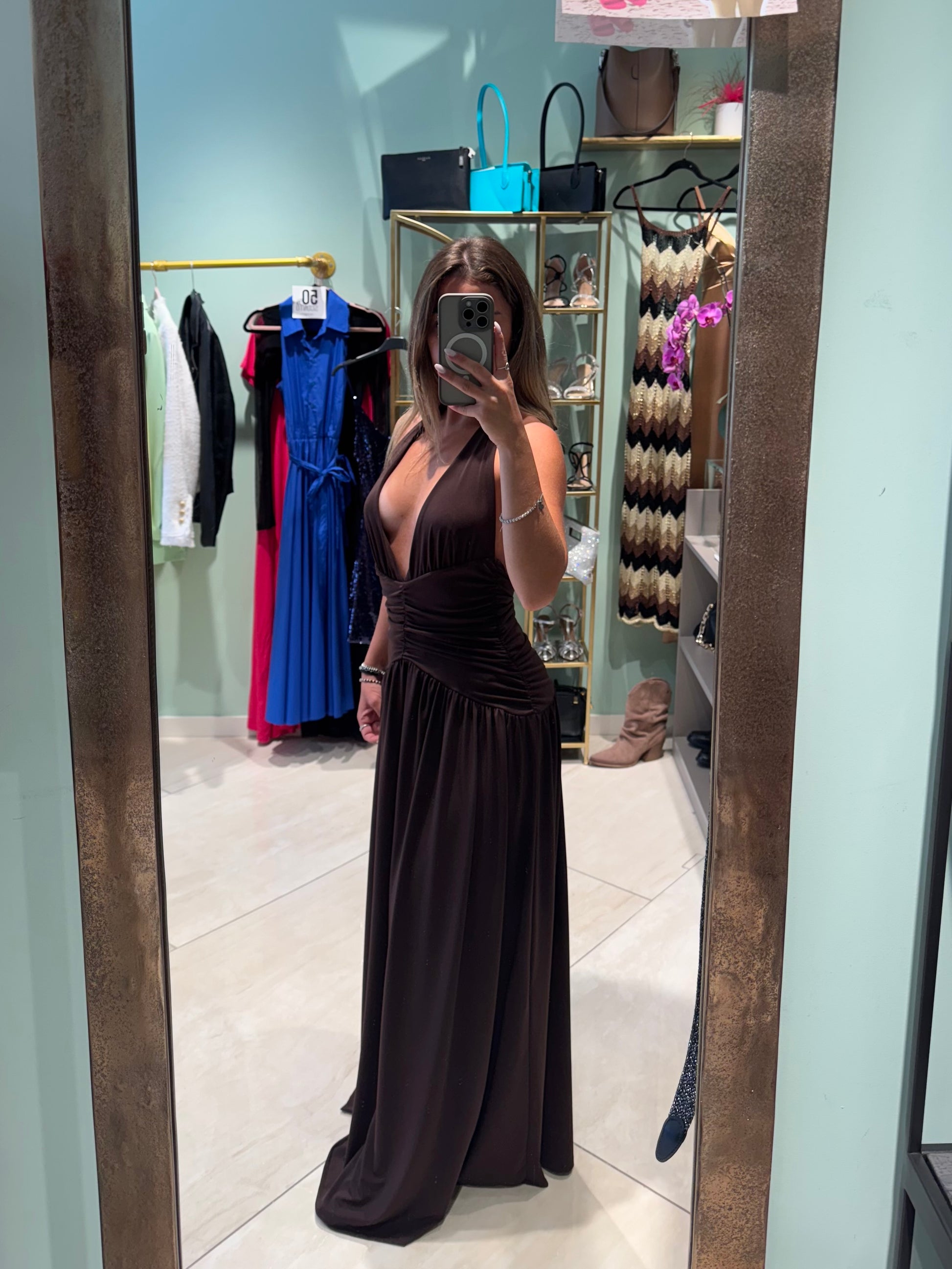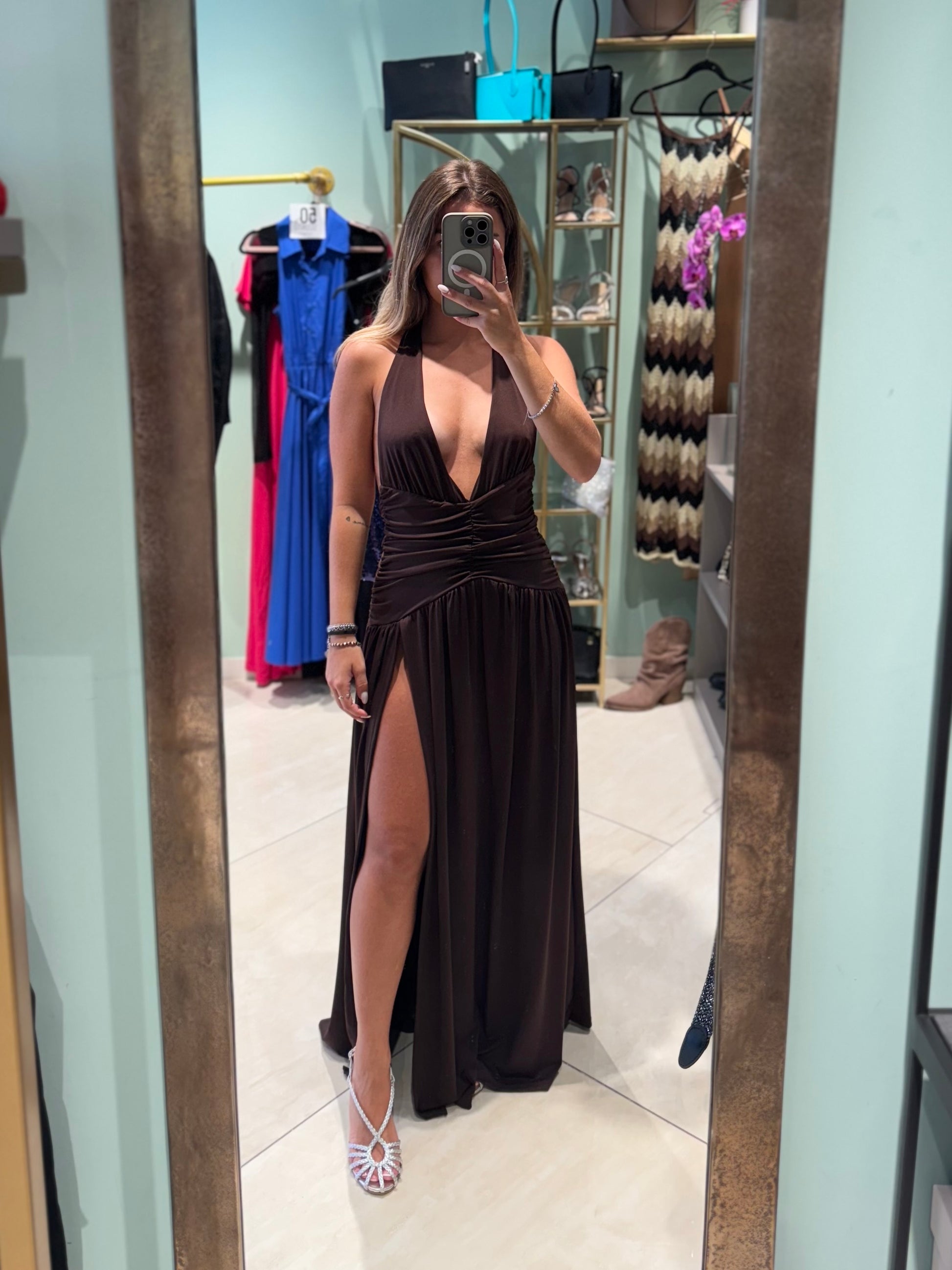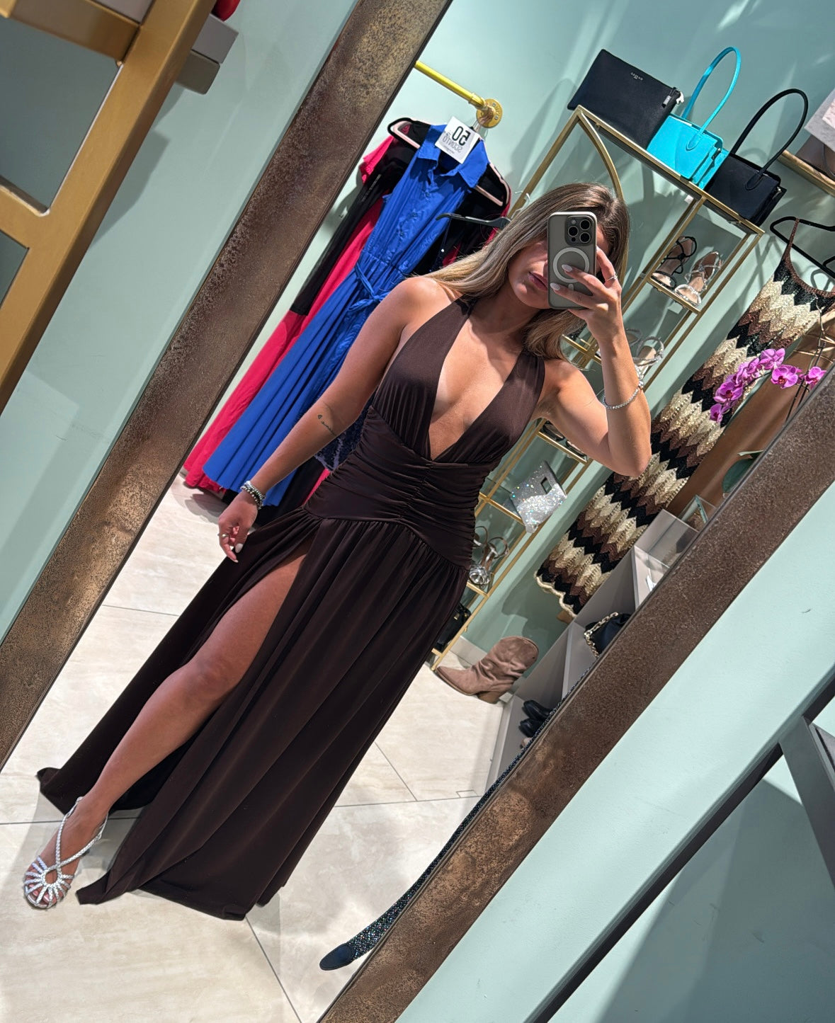 Questo abito color cacao, caratterizzato da uno spacco frontale, unisce eleganza e comfort in un unico capo. La taglia unica è studiata per adattarsi con stile a diverse silhouette, offrendo una vestibilità versatile. Perfetto per occasioni in cui desideri un look sofisticato senza rinunciare alla praticità.
