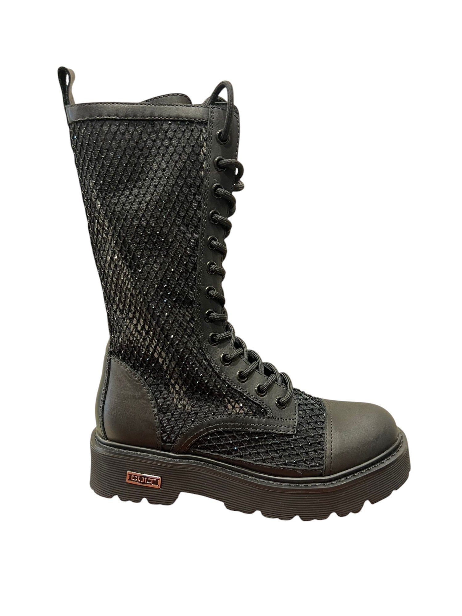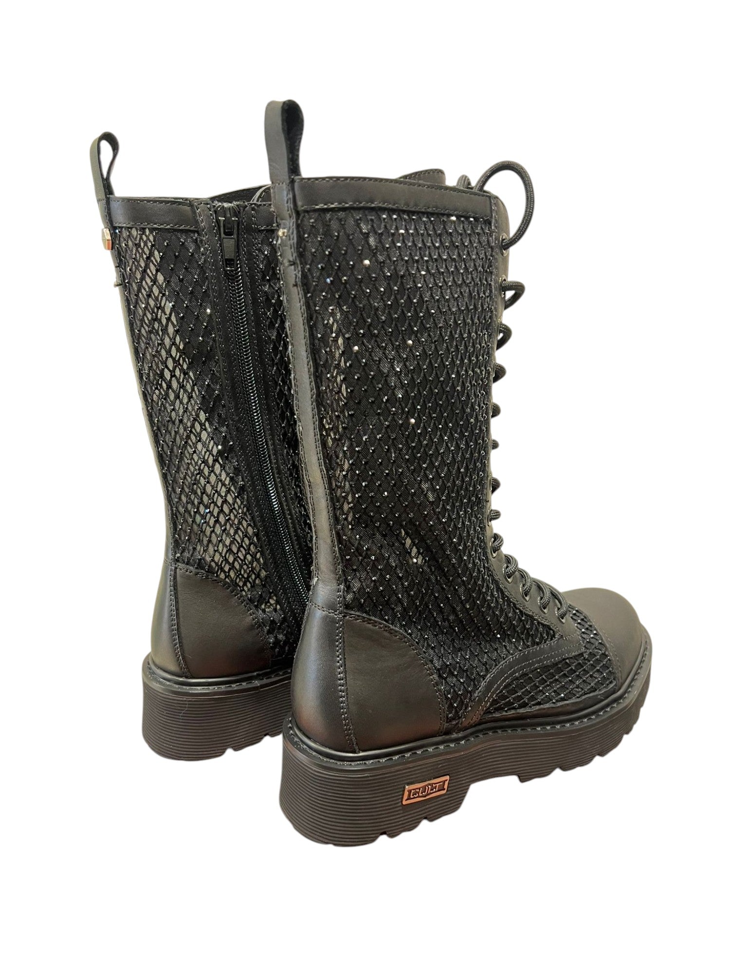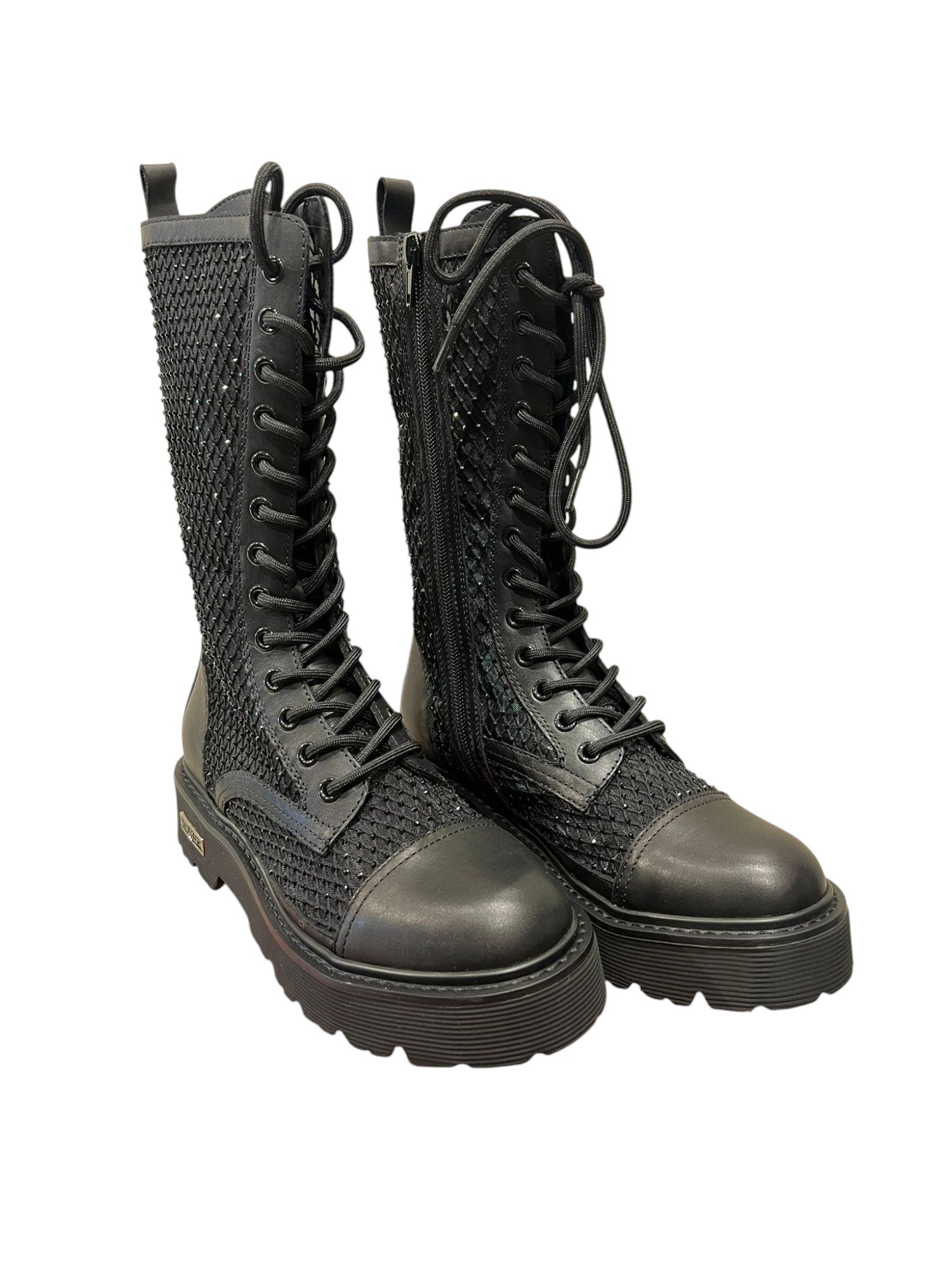 Questo anfibio nero impreziosito da strass unisce robustezza e stile raffinato. Realizzato con materiali resistenti, garantisce comfort e durata, mentre i dettagli in strass aggiungono un tocco di eleganza e originalità, rendendolo perfetto per chi cerca un calzatura versatile e distintiva.