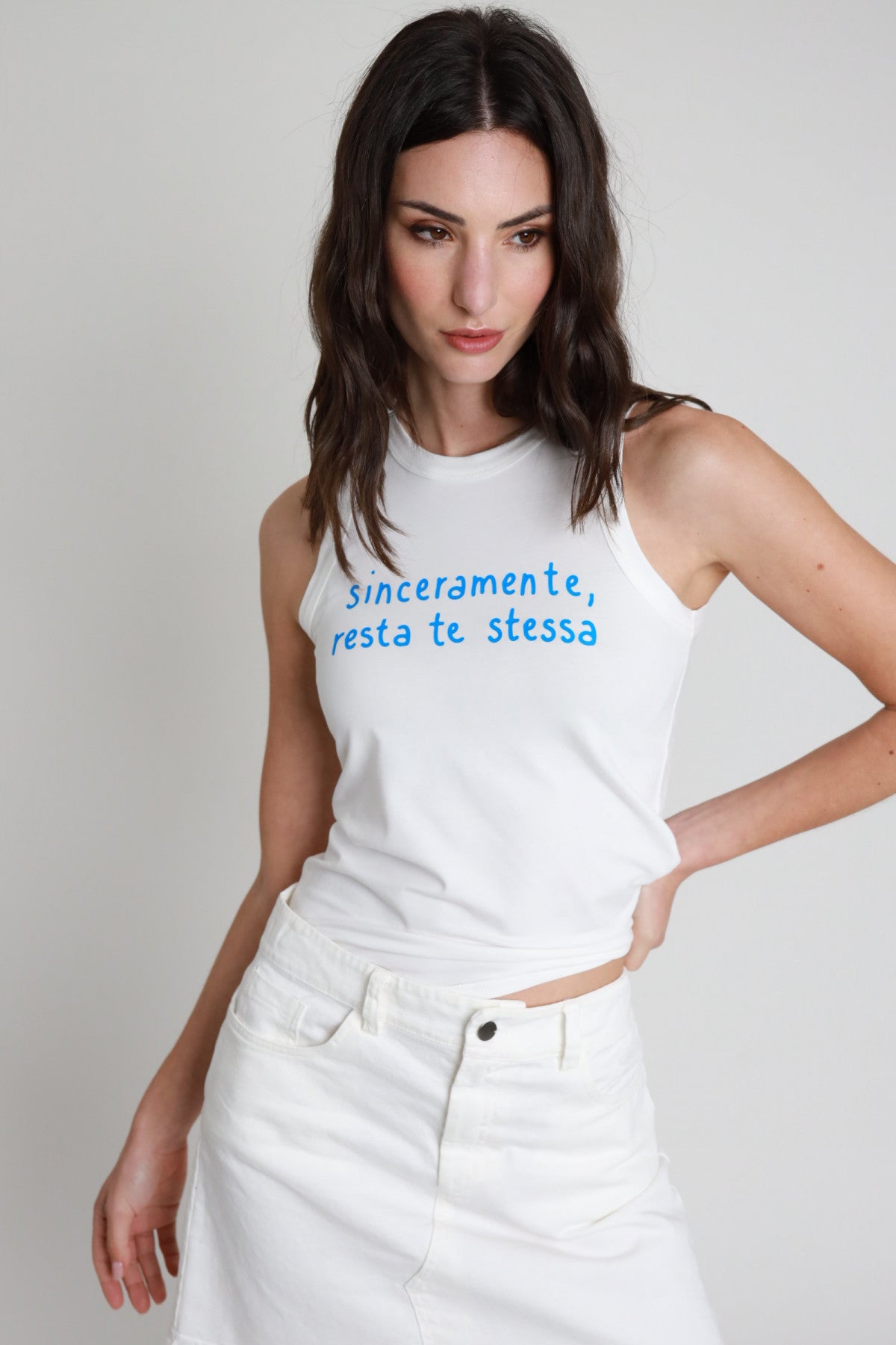 Canotta bianca realizzata in collaborazione con Sinceramente di Bologna, un progetto dedicato alla valorizzazione dell'essere donna. Un capo essenziale che celebra l'identitΓ femminile attraverso un design semplice e consapevole. Perfetta per chi sceglie di indossare un messaggio di autenticitΓ e consapevolezza nel quotidiano.
