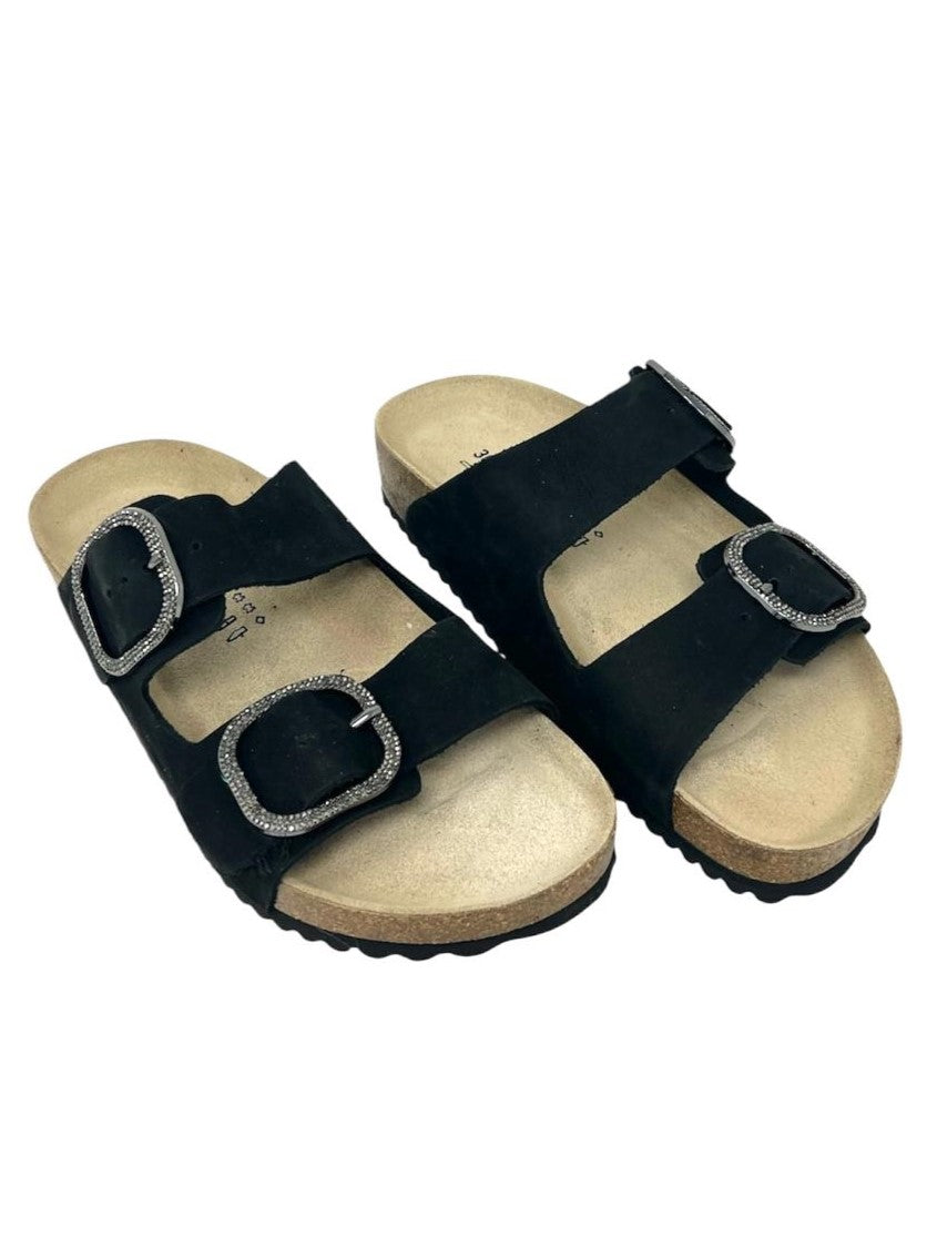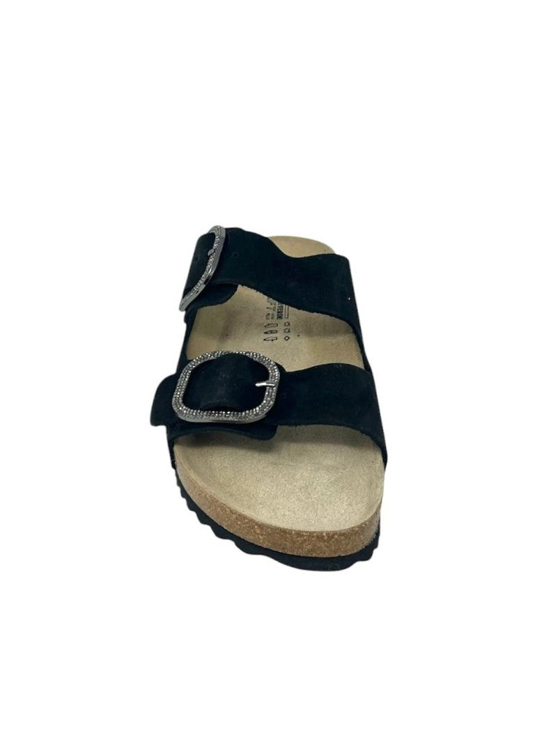 Queste ciabatte in nabuk nero sono perfette per un comfort regolabile grazie ai doppi cinturini regolabili. Realizzate con morbido materiale in nabuk, queste ciabatte forniscono un sostegno ottimale per il piede, riducendo la fatica e il dolore. Ideali per chi cerca una calzatura semplice e funzionale.