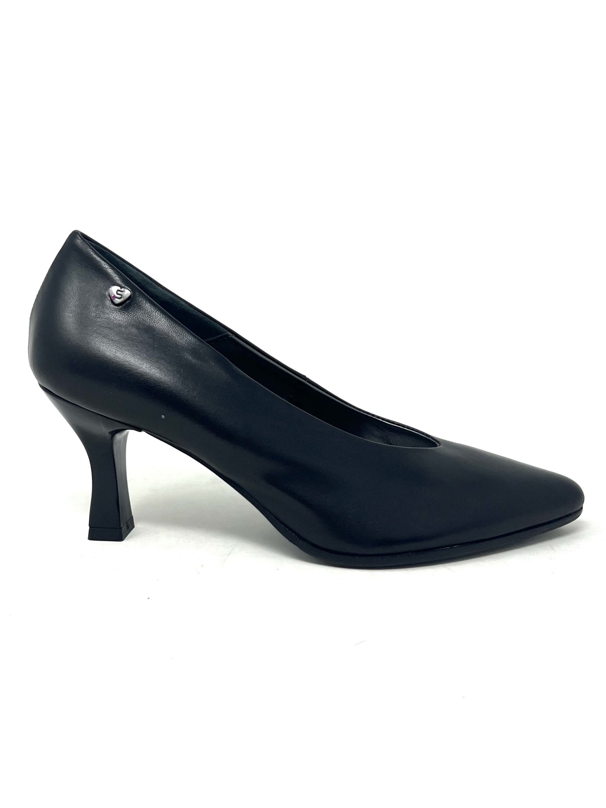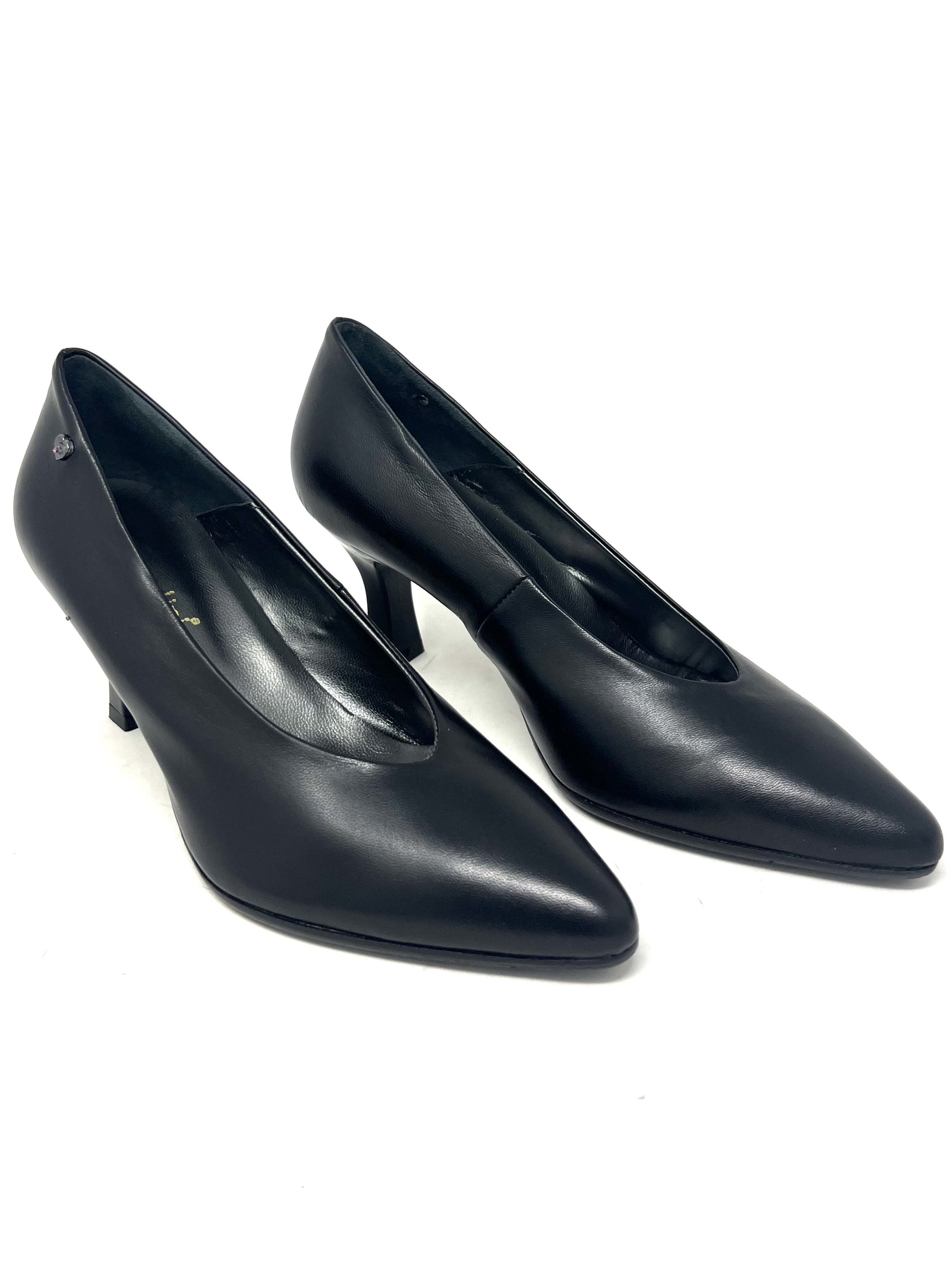 Queste eleganti decolletè hanno un design classico con scollo a uovo e tacco a rocchetto di 9cm. Realizzate in morbida pelle nera, offrono una calzata comoda e adatta anche alle piante larghe dei piedi. Raffinate e confortevoli, sono perfette per completare ogni tipo di outfit. Made in Italy.