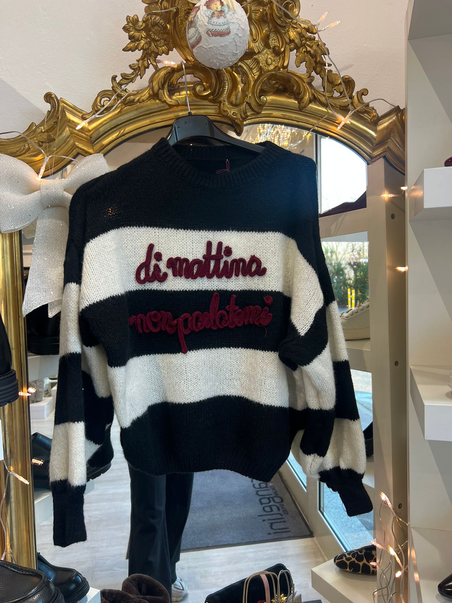 Maglioncino caldo e accogliente con maniche a palloncino che regalano movimento e stile. Le righe delicate creano un effetto visivo interessante, mentre la scritta "di mattina non parlatemi" sulla parte anteriore esprime con ironia la tua personalità. Realizzato in tessuto confortevole e isolante, è il compagno ideale per le mattinate fredde. Un capo che unisce praticità e carattere, perfetto per chi vuole indossare il proprio umore.