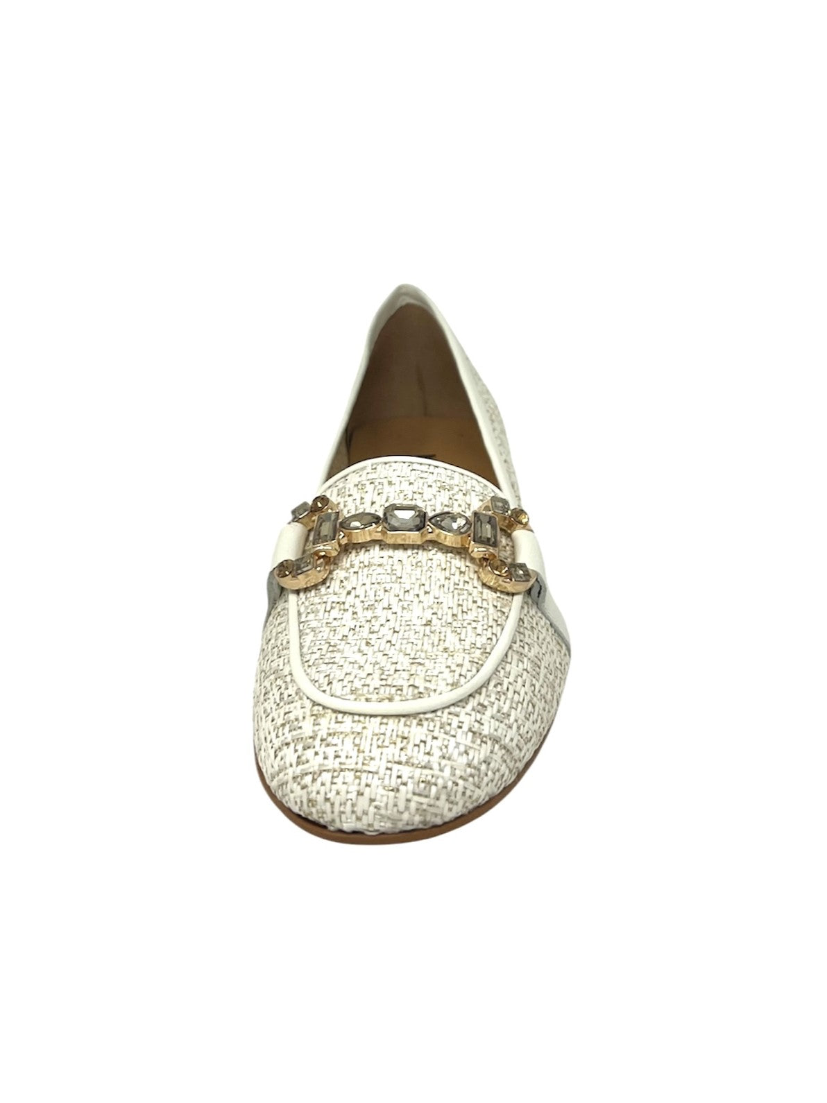 Questo mocassino è realizzato in raffia beige e presenta un comodo cinturino. La calzata comoda garantisce il massimo comfort per tutto il giorno. Ideale per un look elegante e casual allo stesso tempo.