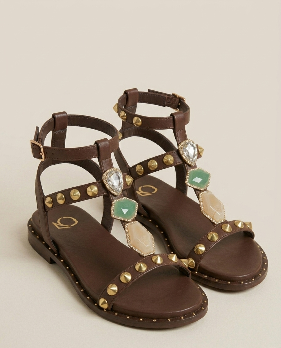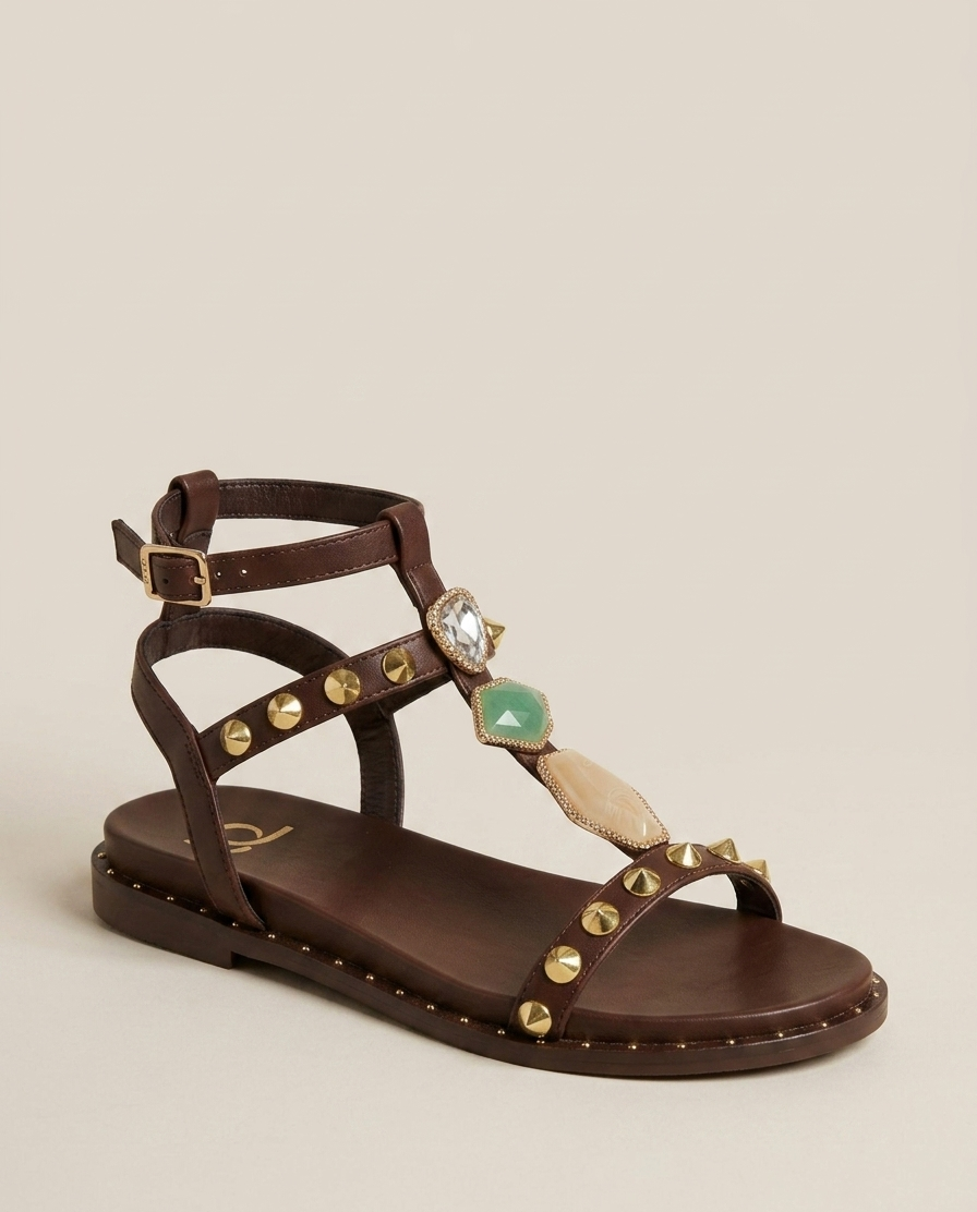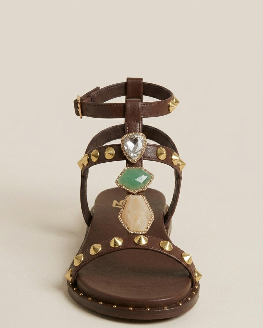 Sandalo basso elegante impreziosito da borchie e pietre che catturano la luce. Il design sofisticato lo rende perfetto per occasioni speciali o per chi ama uno stile audace e ricercato. La silhouette bassa garantisce comfort durante la giornata, mentre i dettagli decorativi aggiungono un tocco di glamour a qualsiasi outfit. Ideale per chi desidera un accessorio che unisce praticitΓ e personalitΓ .