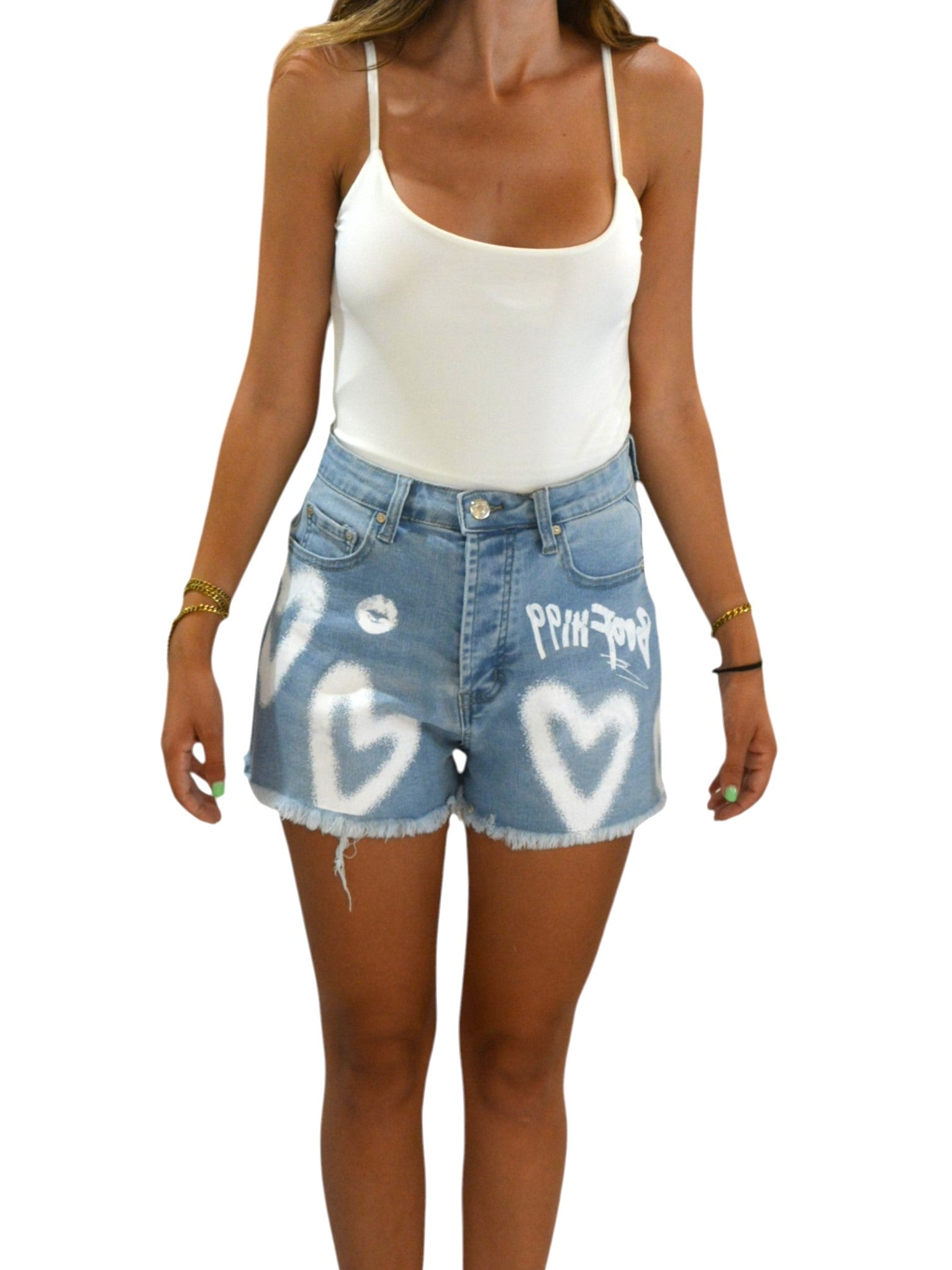 Short in jeans caratterizzati da un design graffito unico, arricchiti da cuori disegnati che conferiscono un tocco creativo e distintivo. Perfetti per chi cerca uno stile originale e contemporaneo.