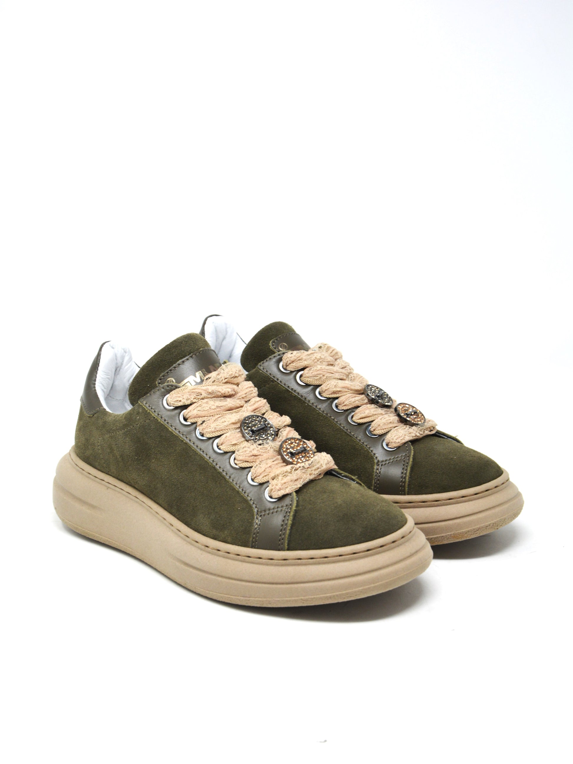 Questa sneaker verde militare con i suoi lacci in pizzo raffinati e una suola marrone abbinata al colore particolare della scarpa, pensata per garantire comfort e durata. I bottoni decorativi, fissati ai lacci, aggiungono un tocco unico e originale a questa calzatura elegante e versatile, perfetta per un look casual ma distintivo.