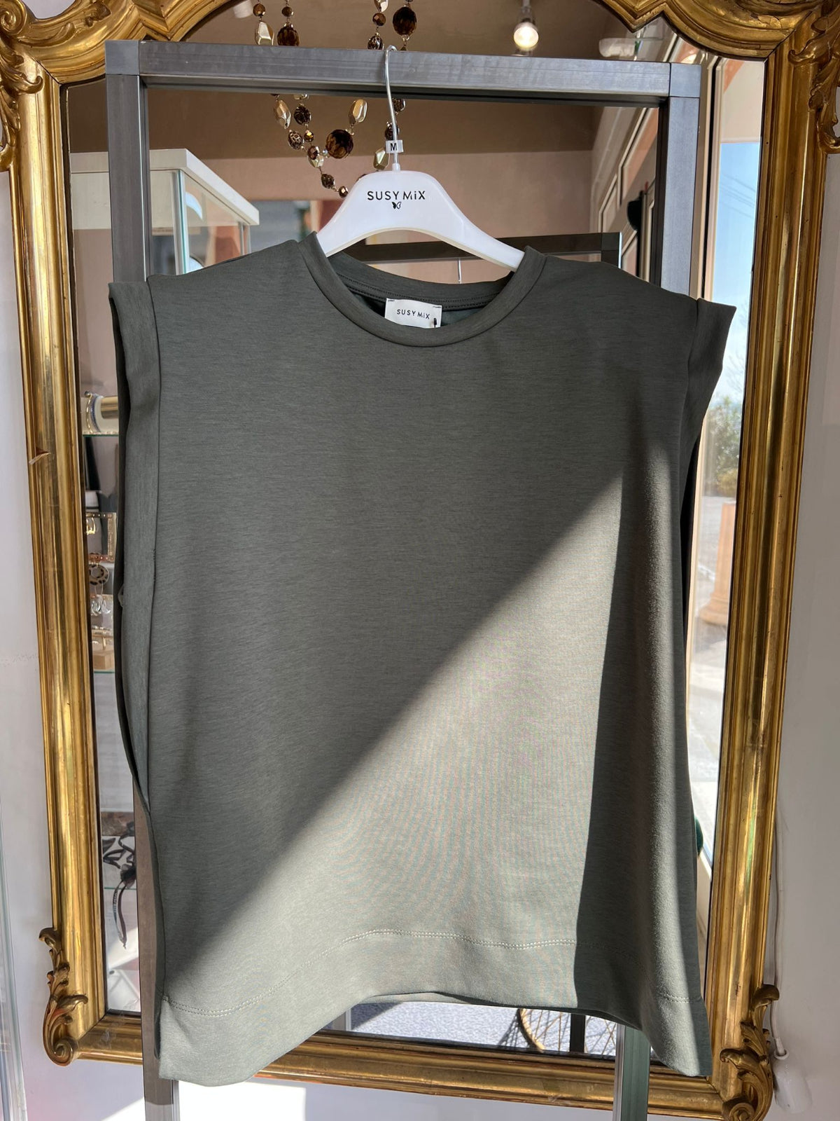 Top smanicato in cotone puro, perfetto per le giornate calde. Le spalline rinforzate garantiscono una vestibilità stabile e confortevole, mantenendo la forma nel tempo. Il tessuto morbido e traspirante assicura libertà di movimento, ideale per uno stile casual e versatile. Disponibile in un elegante verde che si abbina facilmente a qualsiasi guardaroba.